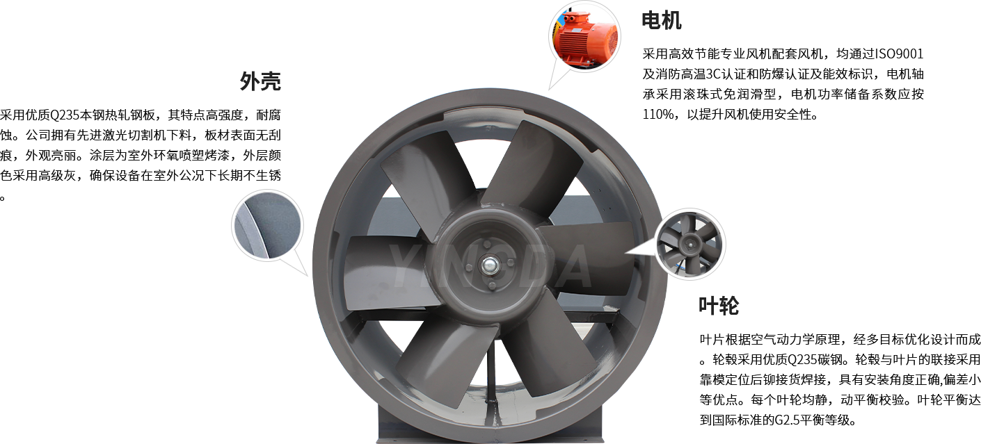 英達風機采用生產(chǎn)電機生產(chǎn)設備和檢查手續(xù)齊全的風機專用配套電機,均通過ISO9001及消防高溫3C認證和防爆認證及能效標識。電機應與風機負載緊密配合,采用B3安裝結構。電機防護等級為IP54,絕緣等級F級,溫升等級B級。電機軸承應為滾珠式免潤滑型。電機功率儲備系數(shù)應按110%取,以提升風機使用的安全性。