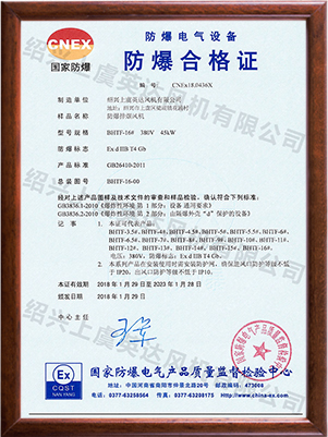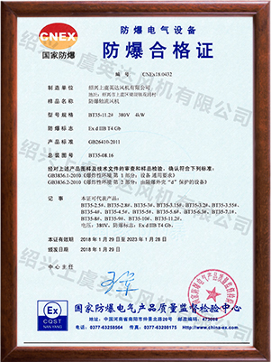 為適應防爆環(huán)境需要,風機可做成防爆風機,防爆等級為EXdⅡBT4,適用于易燃、易爆氣體的場所。整機通過國家防爆認證。