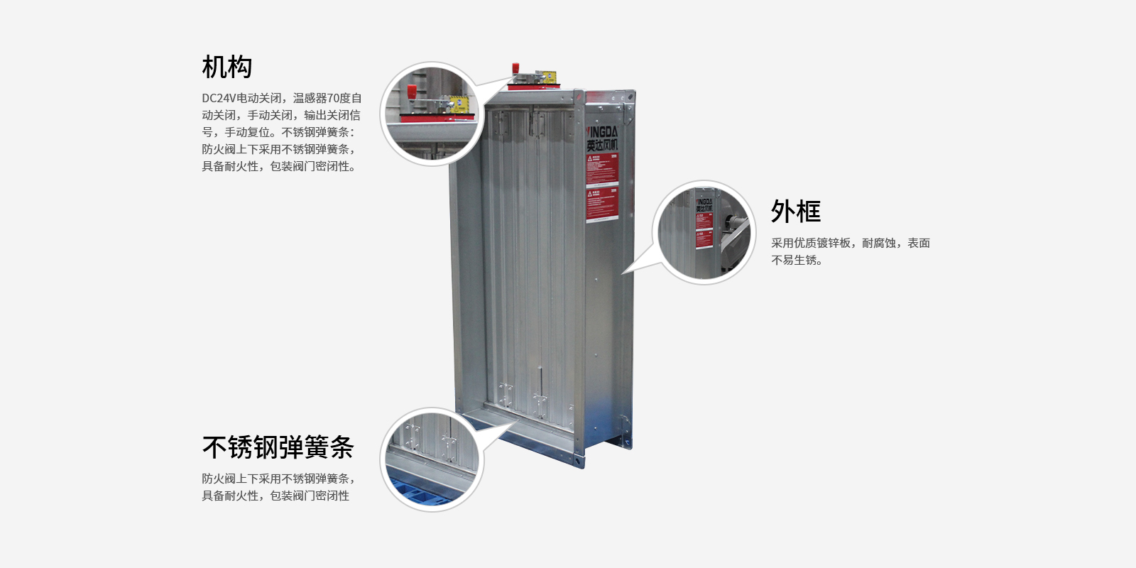 DC24V電動(dòng)關(guān)閉,溫感器70度自動(dòng)關(guān)閉,手動(dòng)關(guān)閉,輸出關(guān)閉信號(hào),手動(dòng)復(fù)位不銹鋼彈簧條:防火閥上下采用不銹鋼彈簧條,具備耐火性,包裝閥門(mén)密閉性。